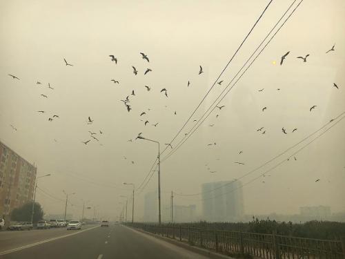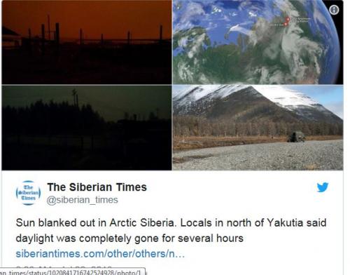 Selon le site d'information régional de Yakoutie, les quartiers Eveno-Bytantaysky et Zhigansky de la Yakoutie sont inexplicablement plongés dans 3 heures de mystérieuse obscurité entre 11 heures et 14 heures. heure locale le vendredi. Les photos fournies par les habitants désorientés montrent un peu plus que les ombres noires des arbres et des bâtiments, projetées contre une brume de ciel rougeâtre. Ajoutant à l'atmosphère inquiétante, l'air semblait être épais avec une brume sale de poussière noire.