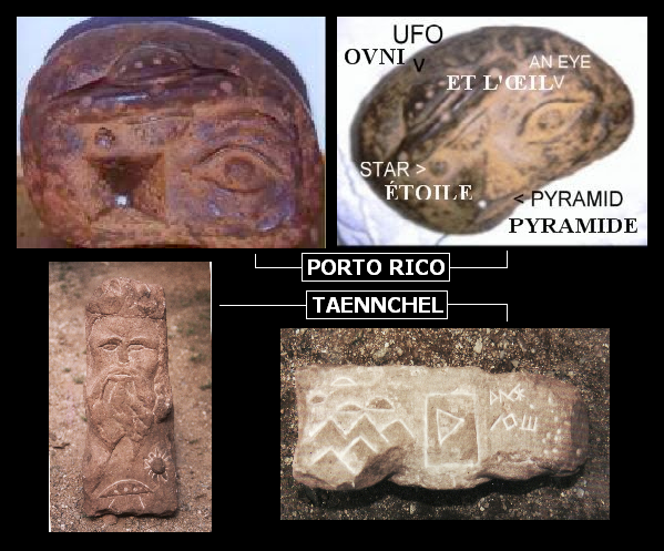 On retrouve : L'ovni, l'étoile dans la statuette de gauche, sans oublier les 4 points blancs dans les deux sculptures d'Ovni (du Taennchel et de Porto Rico).