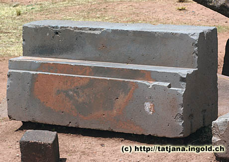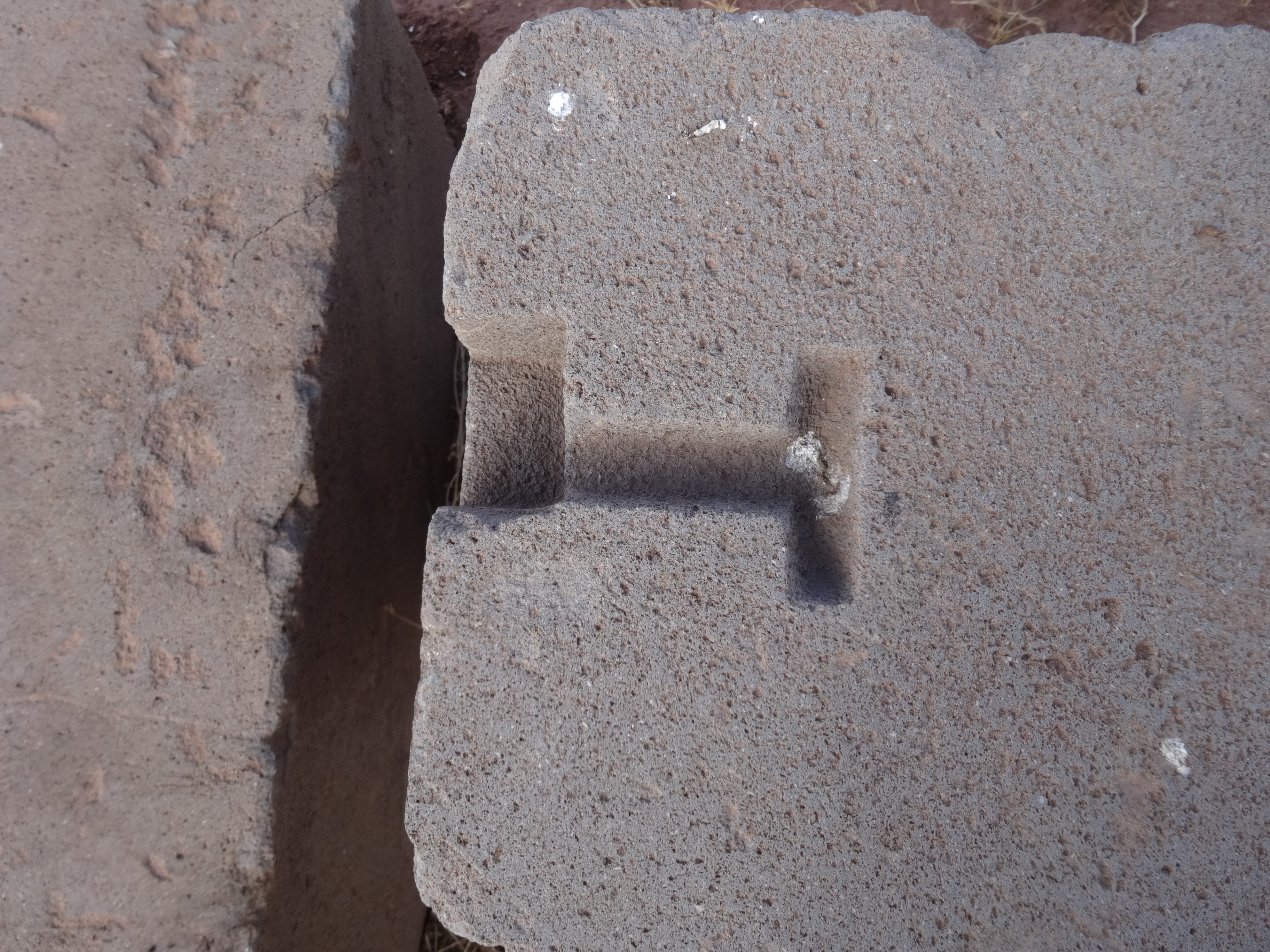 Les archéologues évolutionnistes ne peuvent pas expliquer non plus les marques sur les points où se joignent plusieurs mégalithes à Puma Punku. Elles ressemblent, en fait, à des traces laissées par des presses en métal Longtemps, on a cru que ces presses en forme de T avaient été cuites dans un four, puis refroidies pour être placées dans les indentations des pierres. Des investigations ultérieures menées à l'aide d'un microscope électronique révélèrent toutefois qu'elles furent versées en fusion dans les indentations. Une analyse spectrographique détermina que ces presses étaient composées d'un alliage de 2,05% d'arsenic, 95,15% de cuivre, 0,26% de fer, 0,84% de silicone et 1,70% de nickel. Il s'agit clairement d'une preuve que ces civilisations disparues disposaient d'un matériel sophistiqué pendant la construction de cet édifice.
