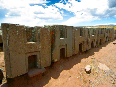 Pumapunku est un vaste complexe cultuel en temple situé à Tiwanaku en Bolivie. En aymara, le nom Puma Punku signifie « la Porte du puma ». Elle est située près de la rive sud-est du Lac Titicaca, sur le plateau andin à une altitude de 3 800 mètres. (wikipedia)