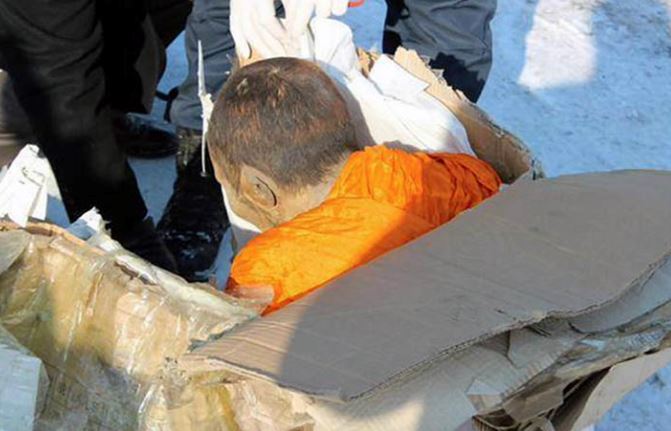 La momie d'un moine décédé il y a environ 200 ans a été retrouvée le 27 janvier à Songino Khairkhan, l'un des districts de la capitale mongole Oulan-Bator. Le moine est dans la position du Lotus, comme s'il méditait encore. Le corps devrait sa bonne conservation à une peau d'animal qui le recouvre.